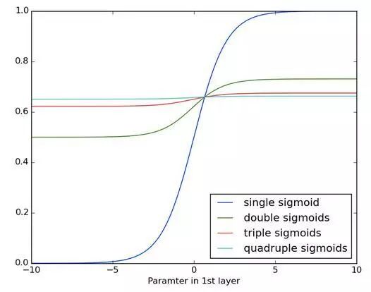 反复应用sigmoid函数的结果如下图所示。数据曲线越来越平缓,直至在较长的距离上无法检测到斜度。梯度在经过许多个层后消失的情况与此相似。