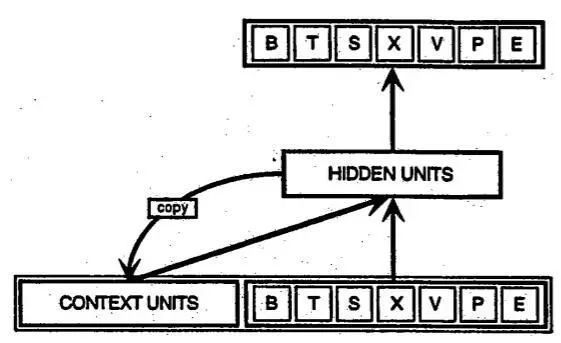 循环网络与前馈网络不同,其输入不仅包括当前所见的输入样例,还包括网络在上一个时刻所感知到信息。以下是[由Elman提出的早期循环网络]的示意图,图中最下行的 BTSXPE 代表当前的输入样例,而 CONTEXT UNIT 则表示前一时刻的输出。