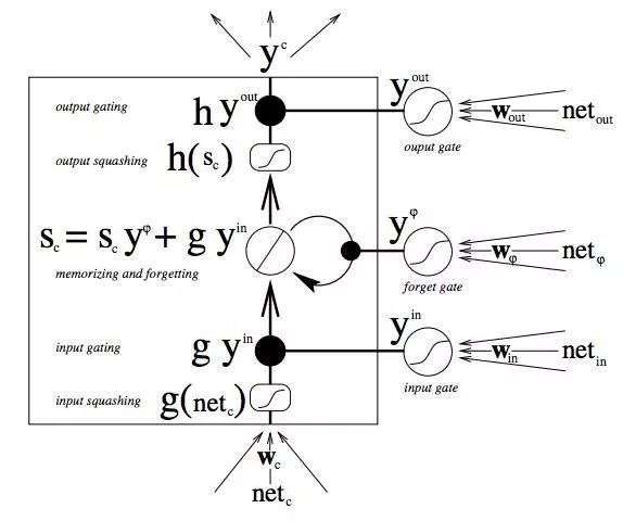 首先,最底部的三个箭头表示信息从多个点流入记忆单元。当前输入与过去的单元状态不只被送入记忆单元本身,同时也进入单元的三个门,而这些门将决定如何处理输入。图中的黑点即是门,分别决定何时允许新输入进入,何时清除当前的单元状态,以及/或何时让单元状态对当前时间步的网络输出产生影响。S_c 是记忆单元的当前状态,而 g_y_in 是当前的输入。记住,每个门都可开可关,而且门在每个时间步都会重新组合开关状态。记忆单元在每个时间步都可以决定是否遗忘其状态,是否允许写入,是否允许读取,相应的信息流如图所示。图中较大的黑体字母即是每项操作的结果。
