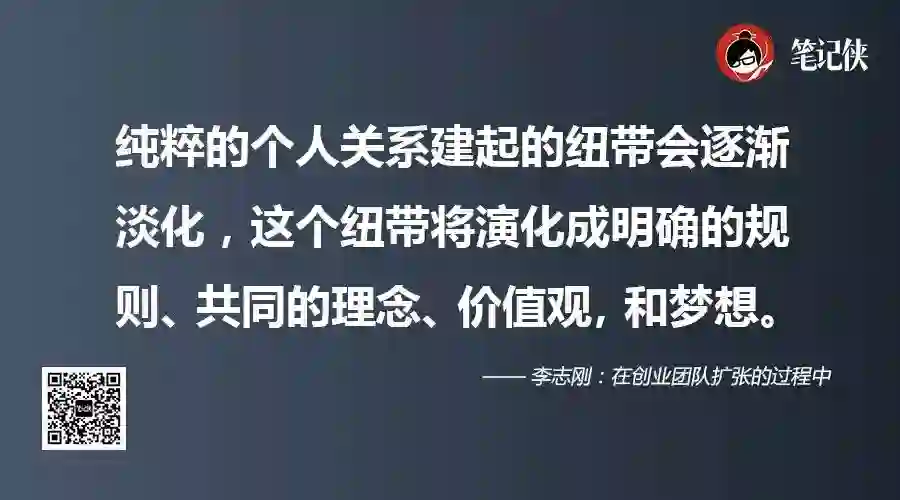 自然,在团队的扩张过程中,这种纯粹的个人关系建起的纽带会逐渐淡化,维系团队的纽带逐渐演化成明确的游戏规则,以及共同的理念、价值观和梦想。