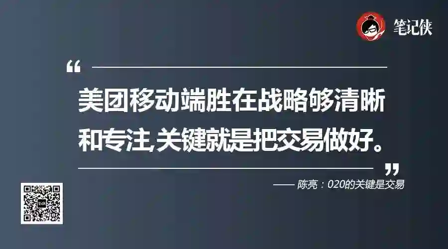 在2011年,陈亮他们没有得到来自高层的太多关注(初期也没有资金),但是美团移动端胜在战略够清晰、够专注——关键就是把交易做好(陈亮:O2O的关键是交易,支付是交易中的至关重要的环节,我们花了80%的精力在这里)。