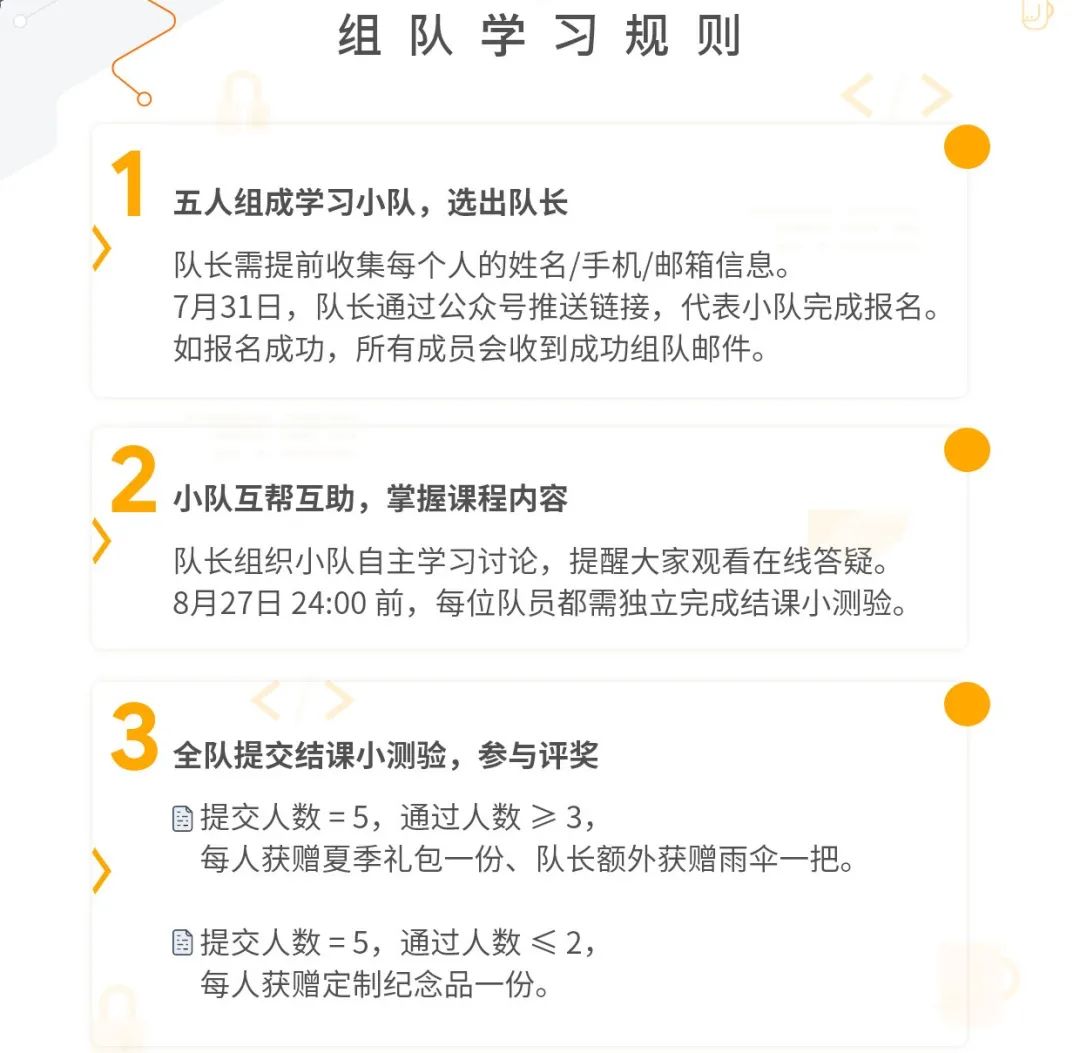 本期课程将采用组队学习的方式,以 5 人学习小队作为基础单位,统一进行报名、考核和评奖。每个小队需选出 1 位队长,负责统筹报名、发起讨论、组织观看答疑、督促队员完成结课小测验等任务(小测验链接将于 8 月 20 日在公众号推送公布),以确保小组学习效率和质量。而在最后的评奖环节中,优秀队长也将获得一份特别礼。