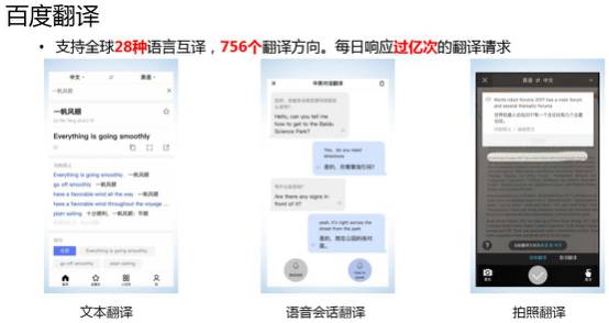 到目前为止,我们讲的都是一种语言,都是中文,但“百度翻译”是解决多语言问题的,在28种语言之间互译,互译的方向大概是700多个,每天有过亿次的翻译请求。同时也结合了语音技术、视觉技术,延伸出了语音会话翻译、拍照翻译等等应用。