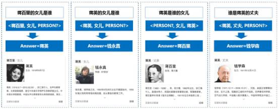 图示:用传统信息检索和搜索算法搜索“蒋英的女儿是谁”和“蒋英是谁的女儿”,会找到同样的答案,因为传统的信息检索是不管语序的。这时候我们就要做真正的自然语言分析和理解,知道它们实际上是在找不同的答案。这背后是知识图谱的支撑,大家可以看到结构化的图文并茂的结果。