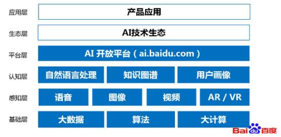 百度从做搜索开始,人工智能的研究和发展已经有十几年了,如自然语言处理基础的分词、短语分析等。而全面布局人工智能大概是在七、八年以前,逐步从NLP、语音、机器学习、图像等方面开始,时至今天,百度已经形成了一个较完整的人工智能技术布局,包括基础层、感知层、认知层、平台层、生态层和应用层,共计六层。