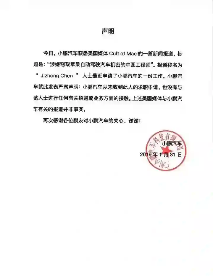 在这次的事件当中,小鹏汽车也受到影响。美国媒体Cult of Mac的一篇新闻报道,标题是:“涉嫌窃取苹果自动驾驶汽车机密的中国工程师“。报道称名为“ Ji zhong chen ” 人士最近申请了小鹏汽车的一份工作。