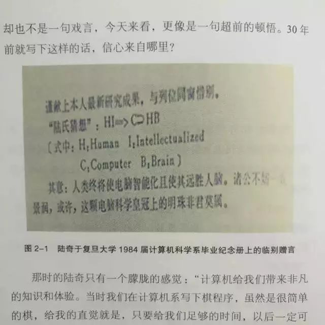 1987年,陆奇还在复旦大学上学,瘦小,精干,喜欢思考一些玄奥的问题,同学们都喊他“陈景润”。毕业时,陆奇在毕业纪念册上写下了临别赠言:谨献上本人最新研究成果,与列位同窗惜别。“陆氏猜想”:人类终将使电脑智能化且使其远胜人脑。
