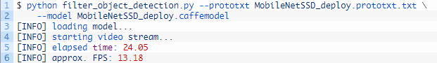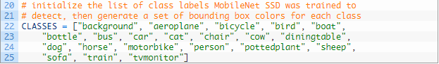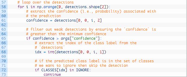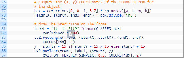 然后,回到 Ezekiel 的第一个问题,我们可以忽略 INGNORE 集合中的类别(#72—73)。如果这个类别是要被忽略的,我们只需返回到顶部的检测循环(不会显示这个类别的标签或边界框)。这符合我们的「quick hack」解决方案。