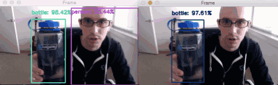 图 6: 使用同一个模型的实时深度学习目标检测演示,在右边的视频中我在程序中忽略了某些目标类别。