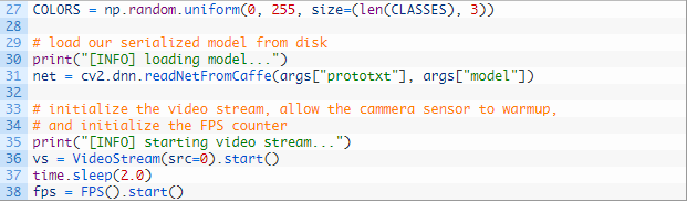然后我们将 VideoStream 对象实例化为 vs,并开始 fps 计数(36-38 行)。2 秒钟的 sleep 让我们的摄像头有足够的预热时间。