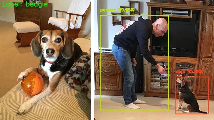 图 1: 图像分类(左)和目标检测(右)的区别是比较直观和简单的。在图像分类中,整幅图像被分类为单一的标签。而在目标检测中,我们的神经网络还要找出图像中目标的位置(有可能是多个)。