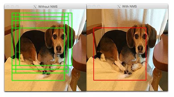 图 3:应用 NMS 会抑制重叠的和置信度不高的边界框。这个方法在一些特定的用例中是有效的,但是它通常比较慢和繁琐,也容易出错。
