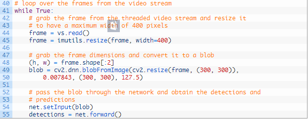 第 48 行和 49 行从这一帧中生成 blob。要了解更多 blob,以及如何使用 cv2.dnn.blobFromImage 函数构建 blob,请在以前的博文中查看所有细节(https://www.pyimagesearch.com/2017/11/06/deep-learning-opencvs-blobfromimage-works/)。