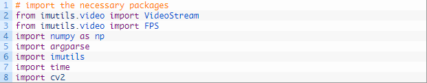在第 2 到 8 行中,我们导入了所需的包和模块,尤其是 imultils 和 OpenCV。我们会使用我的 VideoStream 类处理从摄像头获取的帧。