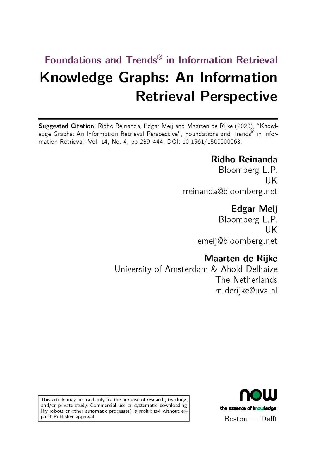 有两种特征的语义搜索的信息检索IR背景: (1)超越“ten blue links”以返回任何相关的结果(比如直接答案,可操作的实体,或关系)和 (2)理解查询和文档,并改善它们之间的匹配和相关关系。理想情况下,搜索引擎能够直接回答用户的信息需求——或者至少生成通过查询表达的信息需求的可能解释。为了实现这一目标,需要各种面向实体的组件来解决信息检索管道中不同阶段的特定问题,包括标识查询中的实体、标识文档中的实体,以及利用实体和关系信息来帮助标识要检索的相关项的方法。尽管事实上,IR和KGs在现代网络和特定领域搜索引擎的背景下日益交织在一起,但文献中并没有从IR的角度对KGs进行广泛的处理,反之亦然。我们的目的是通过本综述提供这一领域以任务为导向的研究概述来填补这一空白。