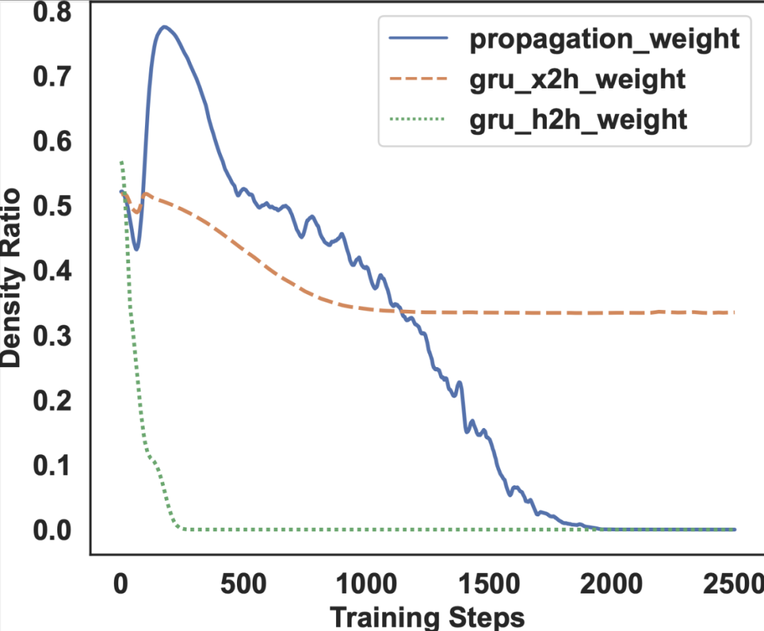 由于 GNN 有很多参数,随着随机初始化,在一开始会有许多要更新的知识。因此我们可以看到图卷积传播权重的 density ratio 在一开始的几个 batch 数据上会有波动。随着训练趋于稳定,该 density ratio 会趋于 0。