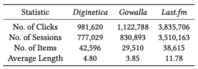 在离线实验中,本文采用了三个不同领域的数据集:Diginetica 是电子商务交易的数据集,Gowalla 是社交网络的数据集,Last.fm 是音乐推荐的数据集。