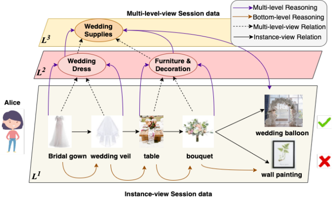 例如,通过综合考虑 Alice 交互的底层商品,人类可以获得一些更高层次的概念,比如 Alice 是否打算筹备婚礼或者装饰新房子。在确定 Alice 很可能是在筹备婚礼后,人类接着会考虑与花束相关的婚礼用品,如婚礼气球,而不是与花束相关的装饰用品,如壁画。