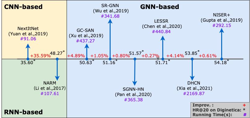 然而,这些模型在基准数据集上的性能提升与其模型复杂度的指数级增长相比显得十分有限。面对这种现象,本文提出了如下问题:这些基于 GNN 的模型是不是对于 SBR 来说过于简单或者过于复杂了?