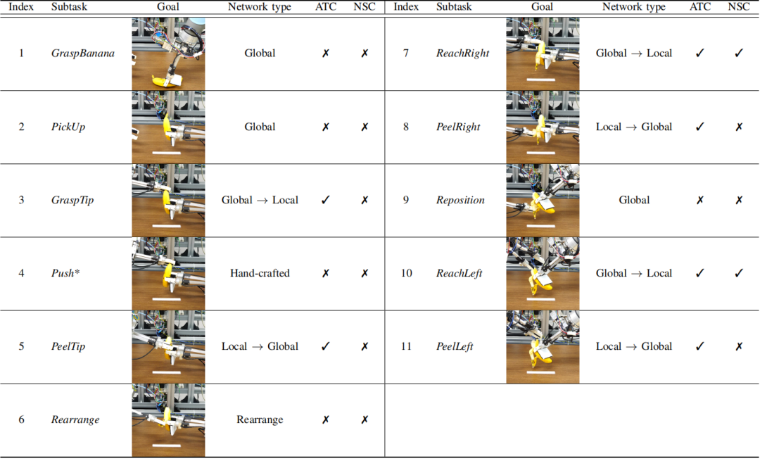 一位研究人员操作机器人剥了数百根香蕉皮,生成了811分钟的演示数据,来训练机器人自己去做这件事,这项任务被分为9个阶段,从抓住香蕉到用一只手把它从桌子上拿起来,用另一只手抓住顶端,剥香蕉皮,然后移动香蕉,这样剩下的皮就可以被剥掉了: