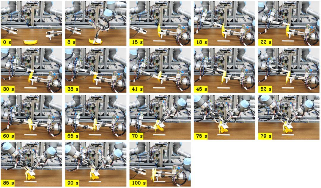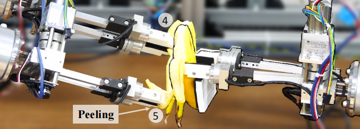 就在最近,日本东京大学的研究人员开发了这么一个机器人,装备有2条手臂和2只手,每只手都有两个可以抓住物体的“手指”。为了训练机器人剥香蕉,一位研究人员在13个小时内剥了数百根香蕉,如此就有了足够的数据来训练机器人做这件事。