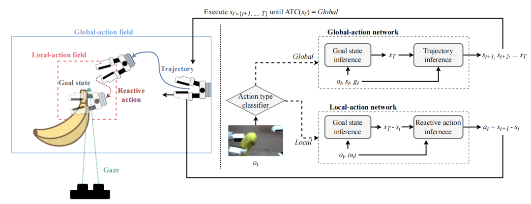 对于不太可能损坏香蕉的大范围运动,机器学习模型会绘制出一条轨迹,模仿人类无需太多思考的行为。但当手臂被要求精确地操纵香蕉时,系统就会切换到一种反应性方法,对环境中的意外变化做出反应。