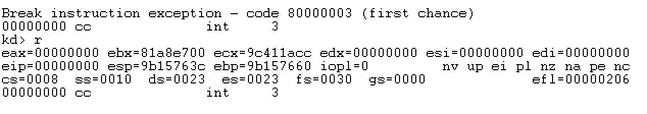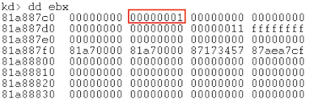 我们可以看到,EIP是00000000h,我们的中断已经被触发了....真棒,我们现在已经控制了内核代码的执行。