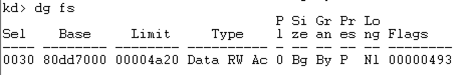 为了使用WinDBG获取fs寄存器的地址,我们可以使用下面的命令: