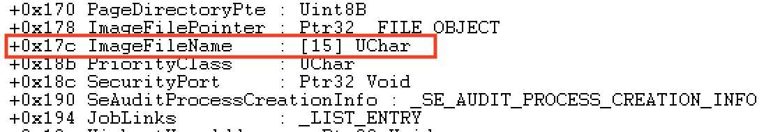 为了找到“cmd.exe”,我们可以借助于在150H偏移处找到的EPROCESS.ImageFileName属性:
