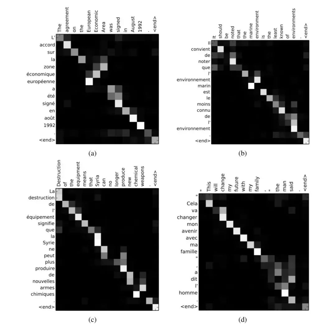 上面 4 幅图中,x 轴代表原始英文句子,y 轴代表翻译为法文的结果。每个像素代表的是纵轴的相应位置的 target hidden state 与横轴相应位置的 source hidden state 计算得到的权重 αij,权重越大,对应的像素点越亮。可以看到,亮斑基本处在对角线上,符合预期,毕竟翻译的过程基本是沿着原始句子从左至右依次进行翻译。