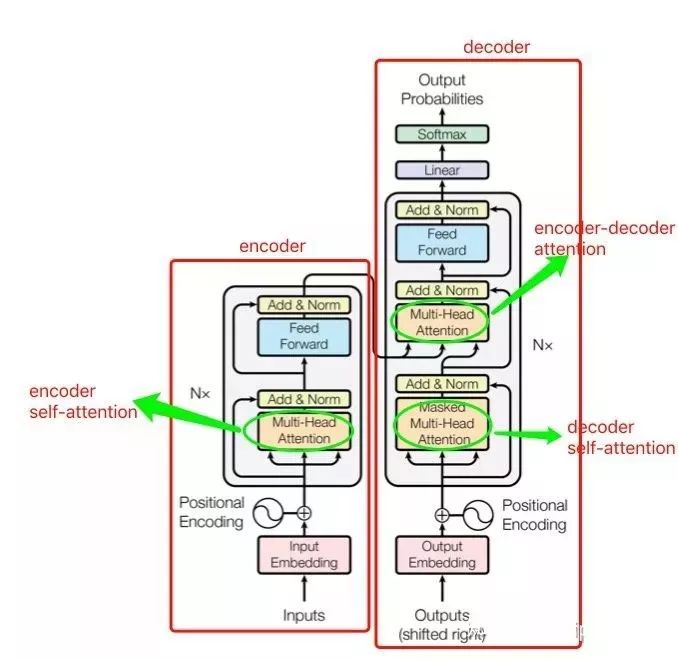 从图中可以看出,模型共包含三个 attention 成分,分别是 encoder 的 self-attention,decoder 的 self-attention,以及连接 encoder 和 decoder 的 attention。