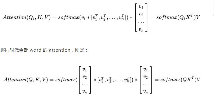 我们记 word embedding 的 dimension 为 dmodel ,所以 Q 的 shape 就是 n*dmodel, K、V 也是一样,第 i 个 word 的 embedding 为 vi,所以该 word 的 attention 应为: