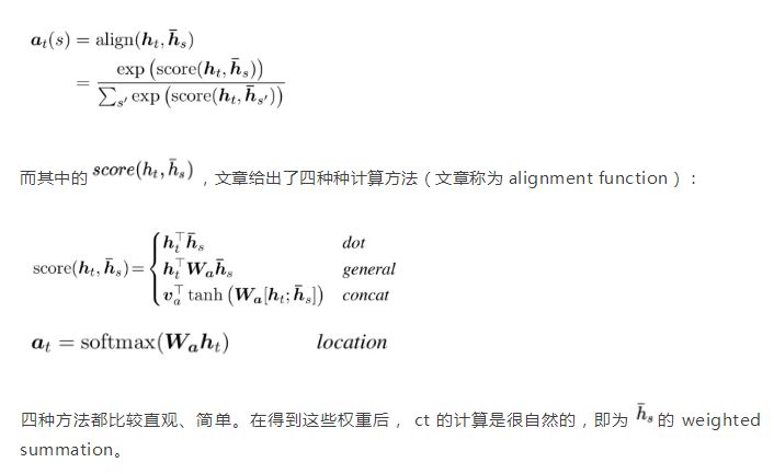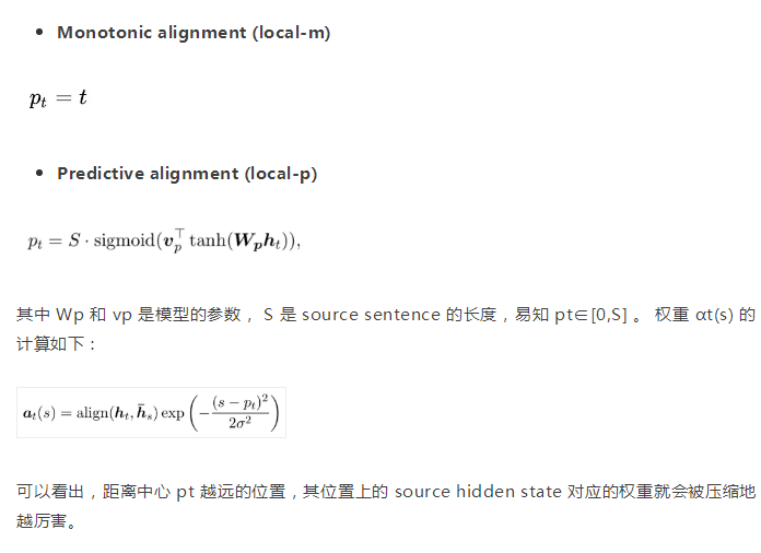 其中 pt 是一个 source position index,可以理解为 attention 的“焦点”,作为模型的参数, D 根据经验来选择(文章选用 10)。 关于 pt 的计算,文章给出了两种计算方案: