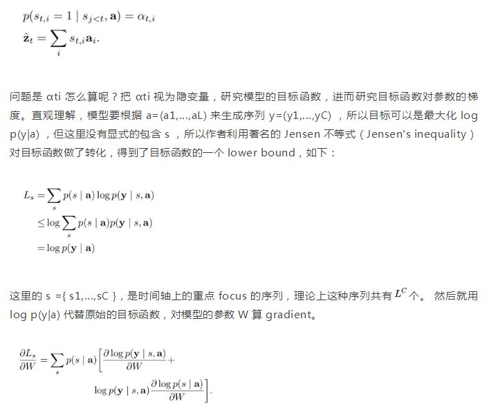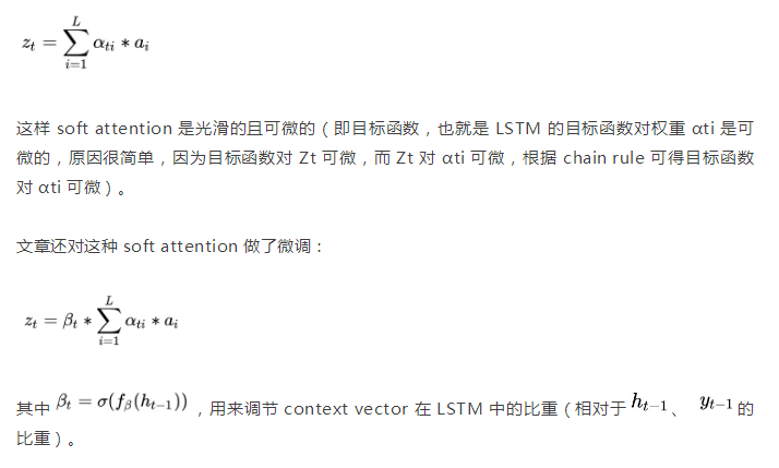 说完“硬”的 attention,再来说说“软”的 attention。 相对来说 soft attention 很好理解,在 hard attention 里面,每个时刻 t 模型的序列 [ St1,…,StL ] 只有一个取 1,其余全部为 0,也就是说每次只 focus 一个位置,而 soft attention 每次会照顾到全部的位置,只是不同位置的权重不同罢了。这时 Zt 即为 ai 的加权求和:
