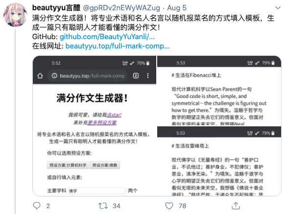 近日,浙江高考满分作文《生活在树上》引发了网友热议。一位作者开源了一款「满分作文生成器」,只要输入专业术语和名人名言就可以生成一篇满分作文了。