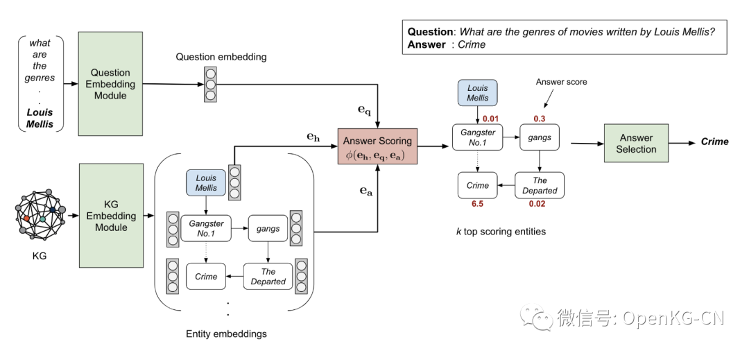 本工作首先学习KG的表示。然后给定一个问题,学习问题的Embedding, 最后,它将这些embedding结合起来以预测答案。