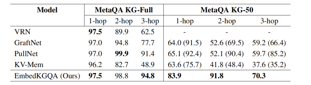 如表1所示,EmbedKGQA在多跳情况下以及在缺失KG的情况下可以超过STOA。