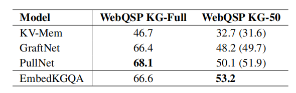 WebQuestionsSP使用了更少的训练样本和更大的KG,这使得多跳KGQA要困难得多。如表2所示,在50%KG的情况下,WebQSP可以超过STOA,包括使用了额外的文本信息的PullNet。这可以归因于这样的事实,即通过KG Embedding隐式捕获了相关且必要的信息。