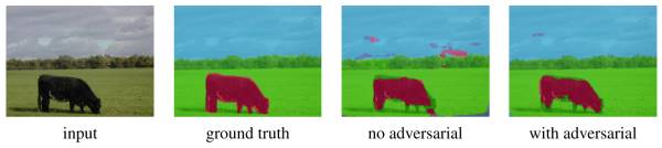 在像素级别尽可能接近,另一方面尽可能使判别器从整体上无法区分它们。下图是一个分割的结果,可见对抗模型得到的结果在空间上更加具有一致性。