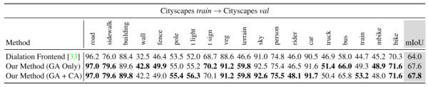 上图是在Cityscapes数据集上的结果。实验中把训练集作为源域,验证集作为目标域,分别展示了只使用全局性的域适应(GA)和类别特异性域适应(CA)的结果。