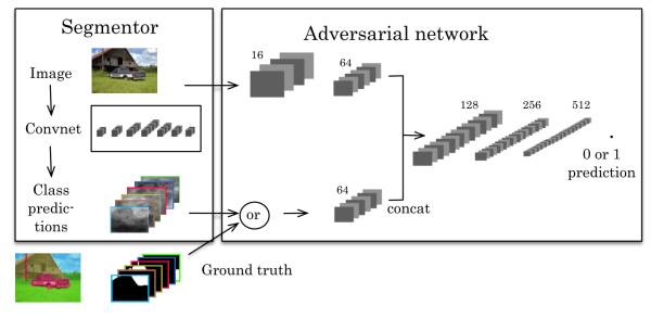 Semantic Segmentation using Adversarial Networks (https://arxiv.org/abs/1611.08408, 25Nov 2016),这篇文章第一个将对抗网络(adversarial network)应用到图像分割中,该文章中的方法如下图。