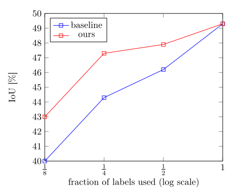 上图是在CamVid数据集上分别使用1/8, 1/4, 1/2 和1/1的标记数据进行训练的结果。相比于蓝线只使用标记数据进行训练,该方法得到了较大的性能提高,如红线所示。