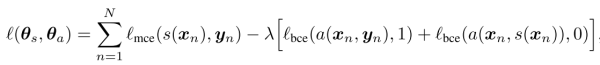 左边是一个CNN的分割模型,右边是一个对抗网络。对抗网络的输入有两种情况,一是原始图像+金标准,二是原始图像+分割结果。它的输出是一个分类值(1代表它判断输入是第一种情况,0代表它判断输入是第二种情况)。代价函数定义为: