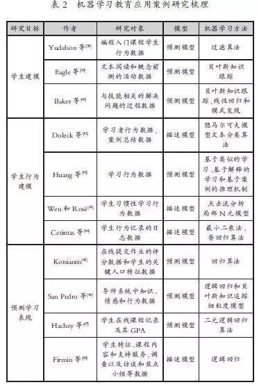 我们通过对文献梳理发现,机器学习教育应用主要集中在学生建模、学生行为建模、预测学习表现、预警失学风险、学习支持和评测以及资源推荐等方面(见表2)。