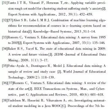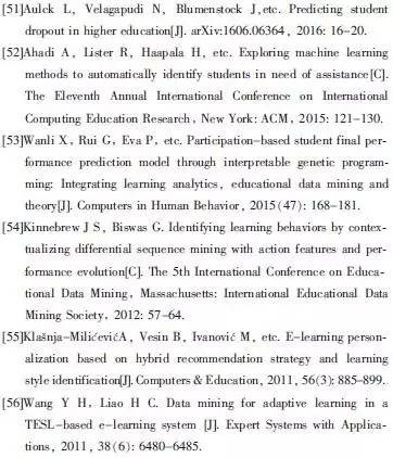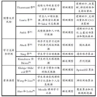 Xing等结合学习分析和教育数据挖掘方法,基于小数据来预测学生在CSCL学习环境中的表现,从而为学生提供相应的教学干预。该研究使用活动理论来整体量化环境中的学生参与情况,并得到六个特征变量,然后使用遗传规划技术来构建预测模型。结果显示,基于遗传规划的模型是可解释的,并且与传统建模算法相比预测率得到优化。