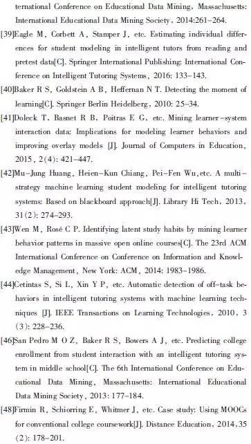 对学习者的领域知识获取、技能发展和完成结果,以及反思、探究和情绪等的监控和评价,也是机器学习研究的重要主题。例如,Kinnebrew和Biswas使用探索性数据挖掘方法,从学生的交互轨迹中评测和比较学生的学习行为。其中,核心方法结合迭代行为抽象和逐段线性分割,迭代行为抽象是区别识别频繁活动模式的序列挖掘技术,逐段线性分割是关于评估表现或进展衡量的活动阶段。研究结果发现,高表现和低表现学生具有不同的阅读行为模式和监控行为。