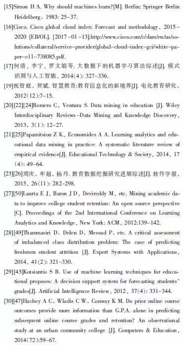 例如,Thammasiri等和Lauía等基于大量的真实学生数据对学生的学术成功展开了研究。其中,Thammasiri等使用机器学习技术对长达七年、特征丰富的真实学生数据进行分析,来预测新生是否会在第二个学期注册继续学习。该研究比较了不同的数据平衡技术来提高少数类的预测准确度,其中包括过抽样算法、欠抽样算法和合成少数类过抽样算法,并连同逻辑回归、决策树、人工神经网络和支持向量机等四种流行的分类方法,构建预测模型来进行比较。研究结果发现,支持向量机结合合成少数类过抽样算法数据平衡技术是表现最佳的分类器,三个数据平衡技术都能提高少数类的预测准确度。在开发的模型中应用灵敏度分析,能够为学生流失的准确预测识别出最重要的变量。这些模型的应用能够预测高危学生,开发有效的干预方法来减少学生的失学率。