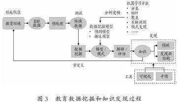 在教育数据挖掘过程中,机器学习主要作用于数据挖掘和解释部分,实现传统教育中缺少或人工难以完成的功能,通过对数据进行自动化分析来发现未知的新知识和模式,如图3所示。