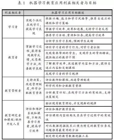 我们通过梳理文献发现,机器学习教育应用的利益相关者包括学习者、教育者、教育管理者、教育研究者和开发人员(课程或软件)等,如表1所示。其中主要目标体现在:支持学习者开展个性化学习,通过学习行为分析预测和可视化反馈,提高学习者的学习表现;支持教育者掌握整体和个体学生的学习情况,自动获得实时客观的教学反馈,促进教学表现的改善;支持教育管理者制定决策,提供客观全面的教育反馈;支持教育研究者和开发人员更精准地评估和维护教育系统和在线课程。
