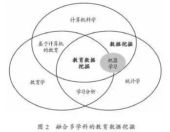 机器学习一般作用于教育数据挖掘过程。教育数据挖掘涉及开发、研究和应用计算机方法在收集的大量教育数据中检测模式,是教育与数据挖掘的融合。数据挖掘技术最早于1995年应用于教育领域,拉开了教育数据挖掘研究的帷幕,此后逐渐发展成为独立的研究领域。教育数据挖掘涉及的学科主要包括教育学、计算机科学和统计学[22],如图2所示。其中,机器学习作为计算机科学和统计学的融合,为教育数据挖掘提供了强有力的技术支持。